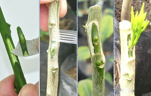 menggabungkan dua tanaman (satu spesies/genus) dengan menyatukan batang bawah (akar) dengan batang atas (entres/tunas)