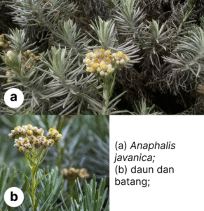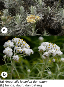 3) Anaphalis spp. atau Edelweis tumbuh pada ketinggian 2000-3000 m dpl. Zona persebaran Anaphalis spp. di Taman Nasional Bromo Tengger Semeru menunjukkan ia dapat tumbuh dengan baik pada daerah terbuka, padang rumput, daerah lereng abu vulkanik, dan daerah yang mendapat sinar matahari langsung. Derah tersebut memiliki suhu rendah, sinar UV tinggi, angin kencang, dan terdapat variasi kelembapan udara dan tanah. Anaphalis spp. memiliki batang berkayu dan bercabang lebat, bentuk daun memanjang dengan permukaan berbulu putih halus dan rapat, adanya braktea (kelopak pelindung) yang tebal dan berbulu pada bunga.